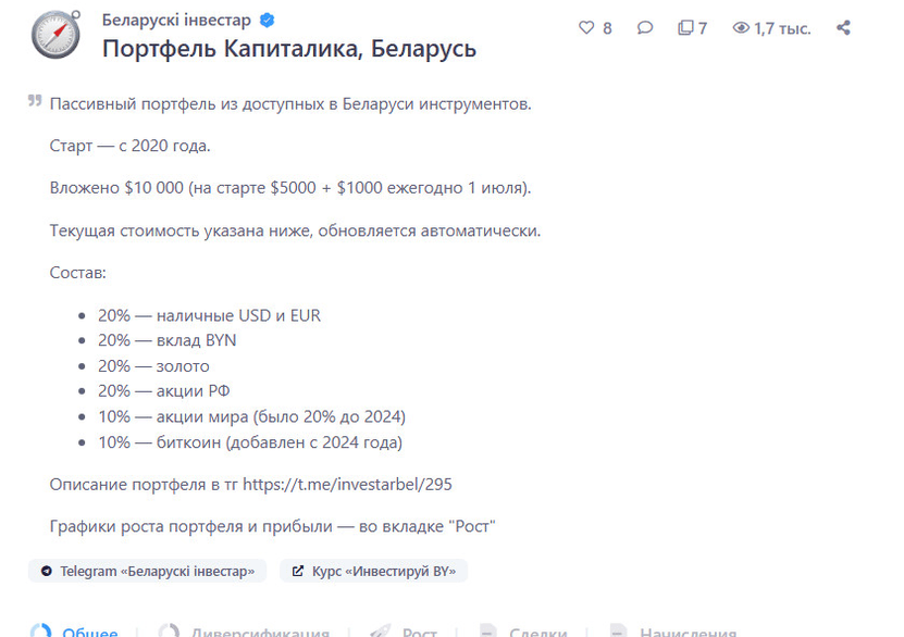Портфель «Капиталика» — это публичный портфель, созданный для резидентов Беларуси. Это не схема для быстрого обогащения, а наглядный пример того, как можно постепенно растить свой капитал в условиях, когда доступ к глобальным рынкам ограничен.