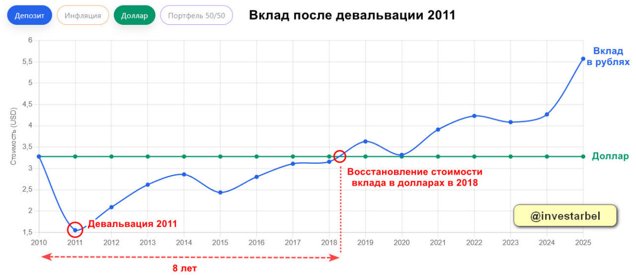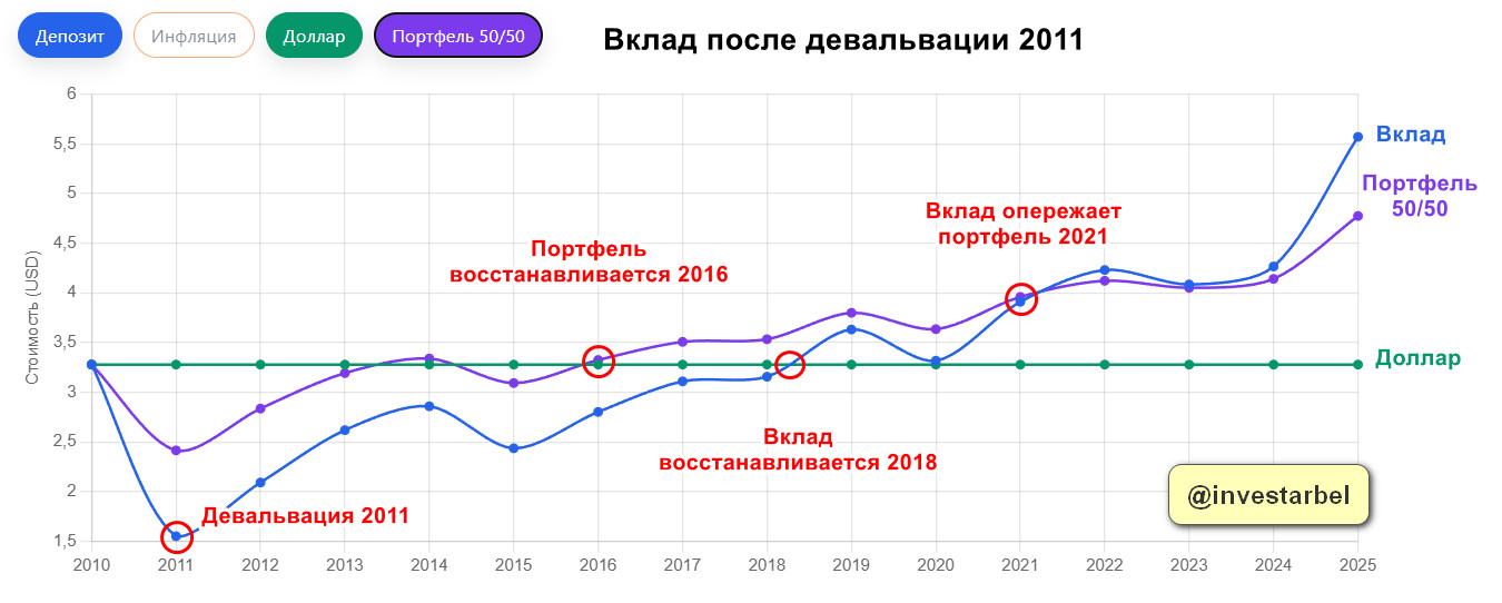 В 2011 году произошла одна из крупнейших девальваций в истории Беларуси — курс доллара вырос в 2,8 раза. Посмотрим, что же было бы, если открыть депозит в конце 2010-го — самое худшее время с 1999 по 2025 гг. Для этого выберем в калькуляторе: Начальный год «2010», конечный можно выбрать «2025», плюс переключатель на валюты на USD. Инфляцию и Портфель можно убрать, чтобы облегчить график. 🟦 Синяя линия – вклад в рублях, в пересчете на доллары 🟩 Зеленая – доллары. Абсолютно прямая линия, деньги просто лежат «под матрасом»